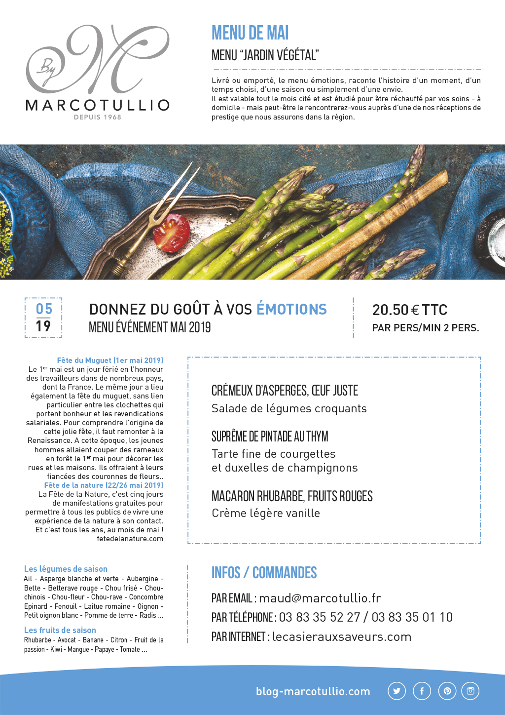 Pour ce beau mois de mai que vous commencerez en offrant un bouquet de muguet, les chefs Marcotullio vous ont concocté un menu « Jardin végétal » qui fait la part belle aux légumes de saison. N’est-ce pas le menu idéal pour fêter comme il se doit la Fête de la nature qui aura lieu du 22 au 26 mai prochains ?